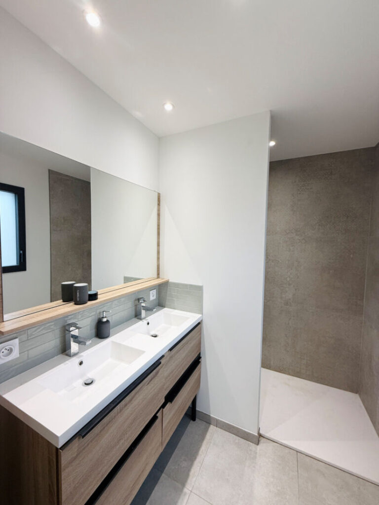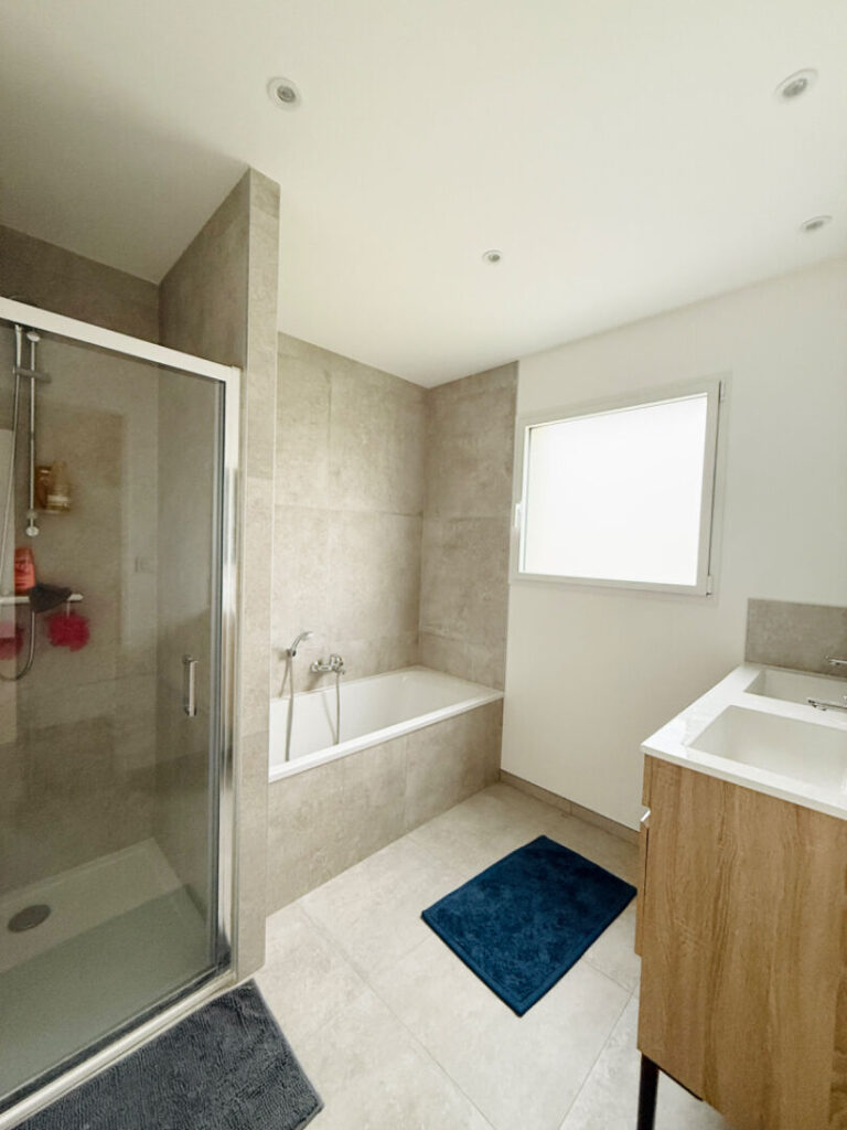 D’une surface habitable d’environ 131 m², elle se compose au rez-de-chaussée d’un salon/séjour lumineux avec une cuisine ouverte aménagée et équipée, d’une suite parentale avec salle d’eau, d’une buanderie et d’un WC indépendant.