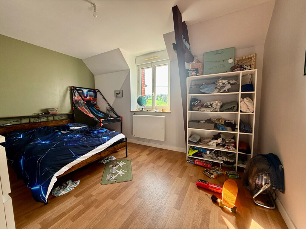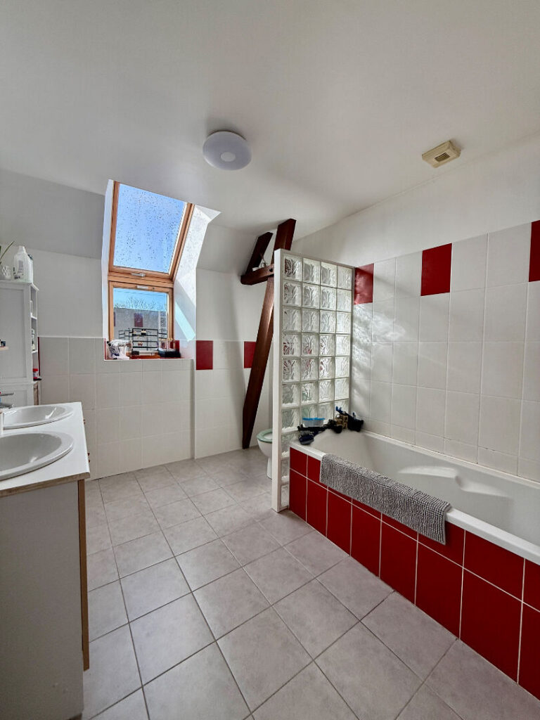 A l’étage : un dégagement desservant trois chambres, une salle de bains avec WC, ainsi qu’un grenier aménageable d’environ 50 m².