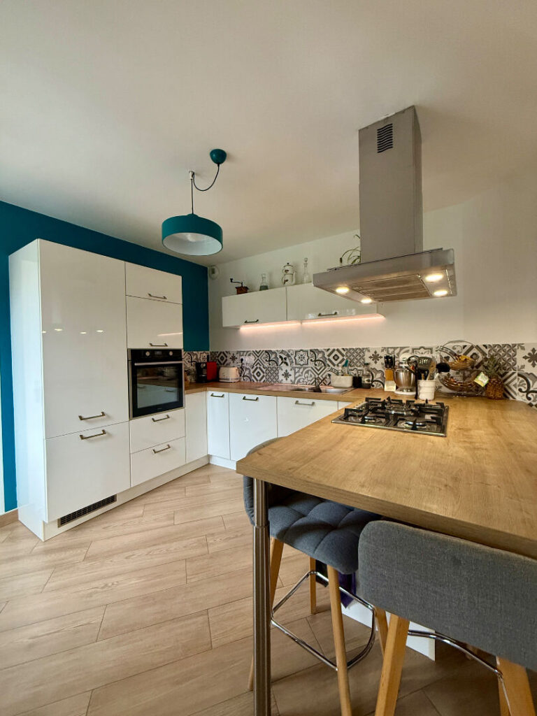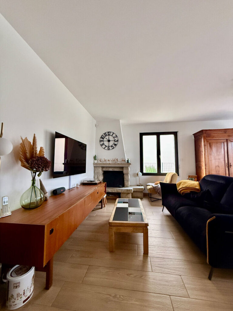 Elle comprend au rez-de-chaussée une spacieuse pièce de vie lumineuse avec accès direct au jardin, une cuisine ouverte, entièrement aménagée et équipée, une suite parentale avec placard, une salle de bains, un WC et une buanderie – arrière cuisine.