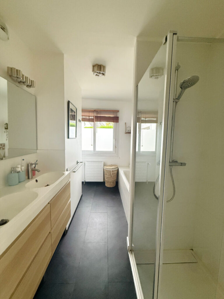 Elle comprend au rez-de-chaussée une spacieuse pièce de vie lumineuse avec accès direct au jardin, une cuisine ouverte, entièrement aménagée et équipée, une suite parentale avec dressing et salle de bains, une seconde chambre disposant également de sa salle de bains privative, un WC indépendant et une buanderie.