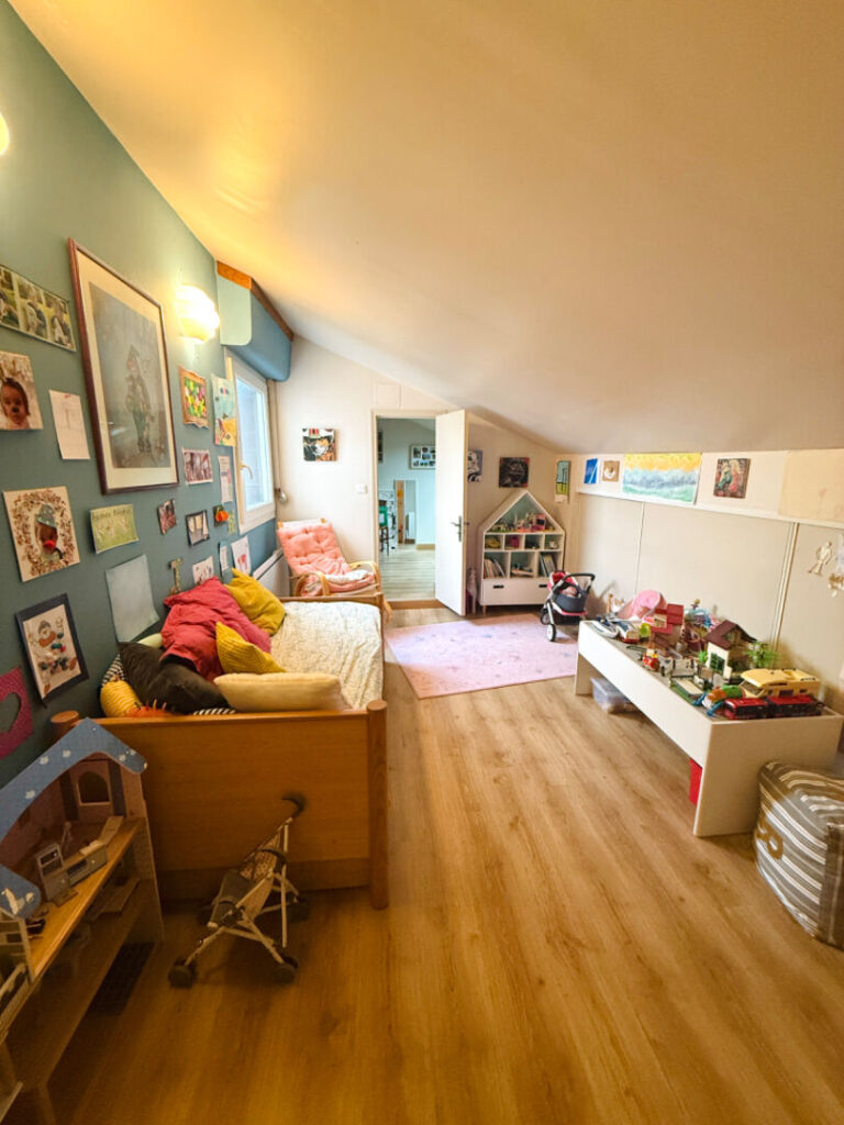 A l’étage, un dégagement, deux chambres supplémentaires, une salle de jeux (ou bureau), une salle d’eau et un WC.